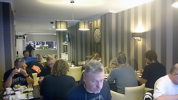 Die größte Überraschung gab es im Hotel. Die Mopeds wurden aus Sicherheitsgründen im Festsaal geparkt und wurden dafür an der Rezeption und den übrigen Gästen vorbeigeschoben. Das Hotel ist interessant. Den Aperitif hatten wir in Belgien, das Abendessen in Holland.